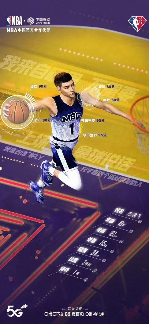 古逸飛目前設定為平行宇宙的大學二年級學生,由咪咕公司自主研發,通過人物背景故事、性格設定、原畫創作、模型制作、骨骼綁定和渲染等一系列方式,賦予了他真實且極具個人色彩的人物屬性。從現場發布的視頻中可以看出,他在球場上進攻天賦十足,兼具熱血與張揚的個性,展現了以籃球運動為內核,兼具潮流、公益、青年文化等多種屬性的多元化數智達人形象。