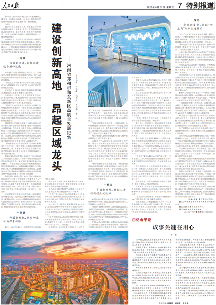 “鄭東新區在‘產出重大原創成果、突破關鍵核心技術、搶占科技競爭制高點’上不斷起勢成勢,力爭早日建成國家創新高地,在黃河流域高質量發展中發揮區域增長極作用。”?河南省委常委、鄭州市委書記安偉說。