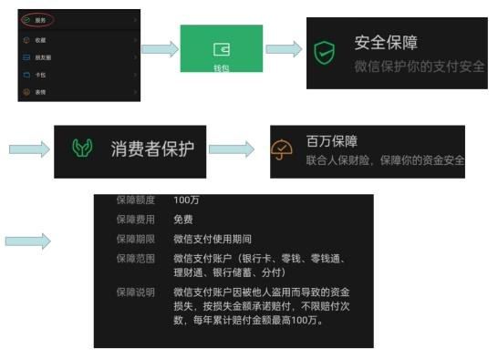 第二步,指導用戶查看自己微信支付內的“百萬保障”,以用戶查到的微信頁面為依據(如前文所述,該頁面是真的),說服用戶相信不法分子自稱的“微信百萬保障工作人員”身份以及接下來的騙術。