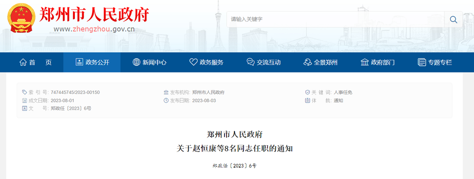 鄭州市人民政府關于趙恒康等8名同志任職的通知