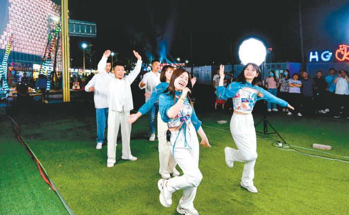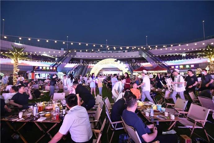 章魚燒、特色酥肉、撈汁小海鮮、小龍蝦……在星空夜市,10多家風味小吃攤在環形下沉廣場中圍成一圈,中間空地上擺放著幾十張桌子,每天晚上都是座無虛席。自6月13日正式營業起至10月底,每天晚上都有一個半小時的常態化小型演出,有搖滾、民謠、說唱等表演節目,戲曲、器樂、街舞、脫口秀等也將輪番上演,讓市民感受到夏日的激情與狂歡。