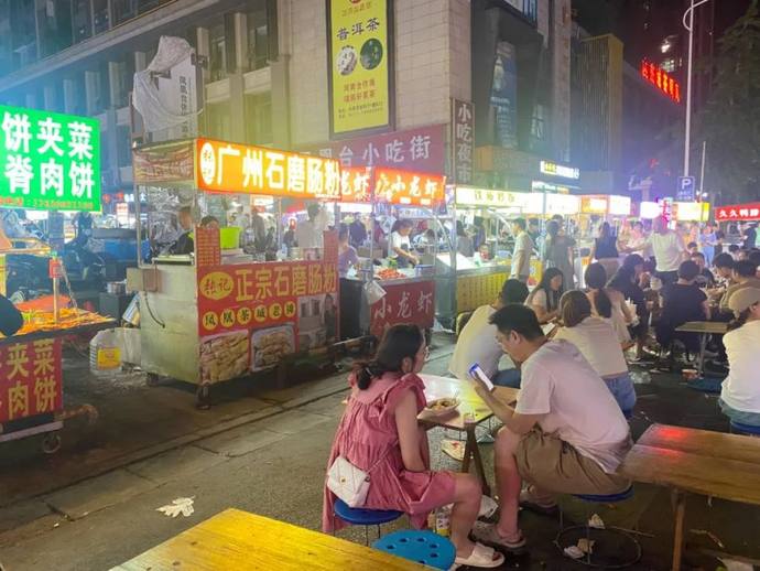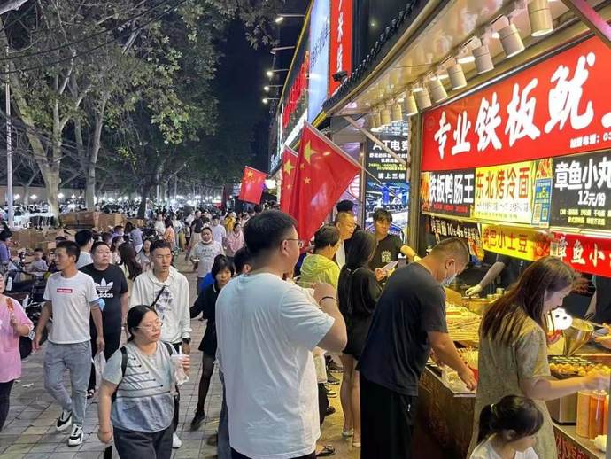 在這條鄭州最大的夜市街上,最不能少的就是美食,不管是河南本地的小吃,還是全國各地的名小吃,在這條街上都能找到。夜晚的健康路,燈火通明、人頭攢動,此起彼伏的吆喝聲,小吃攤前排著的長隊……活力與香味融合,繪出一片人間煙火氣。