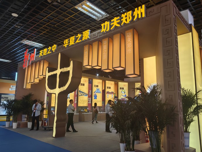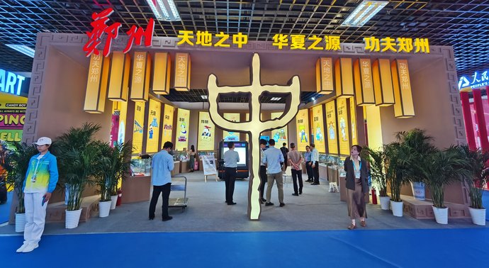 鄭州展館位于文化產業綜合館,總面積142平方米,以“天地之中 華夏之源 功夫鄭州”為主題,整體結構分內外兩部分。外部主框架以“天地之中”的“中”為展示核心,正面設計制作巨型“中”字結構,凸顯鄭州地處中華腹地史謂“天地之中”的城市定位。內部分內外兩側展示鄭州“華夏之源、功夫鄭州”主題相關內容。內側以鄭州歷史時光軸為背景,從10萬年前織機洞史前文化、8000多年前裴李崗文化、6000多年前大河村文化,5000多年前黃帝史詩,3600多年前商都文明時期直至當代鄭州,選取15個具有代表性的歷史文化節點通過圖片、文字及實物形式進行展示,充分展現作為華夏文明重要發祥地的鄭州城市文脈。外側展示文化企業設計的不同形態卡通少林武僧形象,與“功夫鄭州”主題交相輝映,生動活潑地宣傳鄭州城市形象。