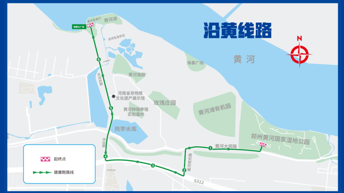 鄭州黃河國家濕地公園→黃河大壩路→黃河觀光路→黃河旅游公路→天河路→天河北路→南裹頭廣場