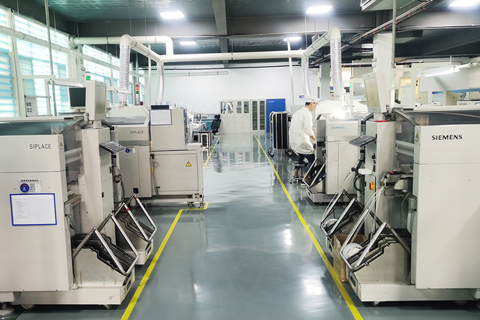 走進公司生產車間,兩條德國西門子SMT自動貼裝設備和插件生產線每小時可完成6萬~8萬焊點,自動上料、自動印刷、自動檢測.....家用報警器自動裝配生產線,每10秒可產出一臺標準化產品。