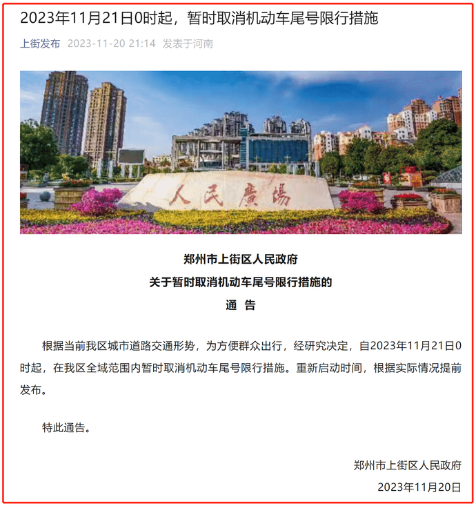 11月20日晚,上街區發布信息,根據當前上街區城市道路交通形勢,結合大氣污染防治效果,為方便群眾出行,經研究決定,自2023年11月21日0時起暫時取消機動車尾號限行措施。