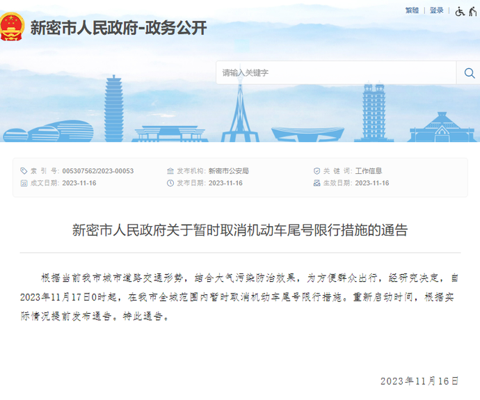 11月16日,新密市發布信息,根據當前新密市城市道路交通形勢,結合大氣污染防治效果,為方便群眾出行,經研究決定,自2023年11月17日0時起,暫時取消機動車尾號限行措施。