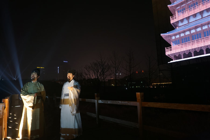 到了晚上,冬奧會上的冰屏技術被搬到了現場,在高達7米的冰屏夕陽樓映襯下,現代科技與古典意蘊交織形成的視覺沖擊力更加強烈。