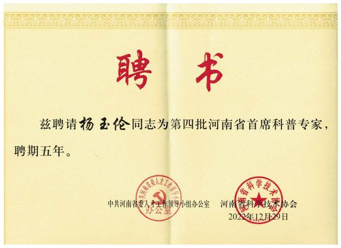 日前,2024年度河南省首席科普專家工作室授牌儀式在省科技館新館舉行。鄭州人民醫院胸外科主任醫師楊玉倫獲支持建設“河南省首席科普專家工作室”。