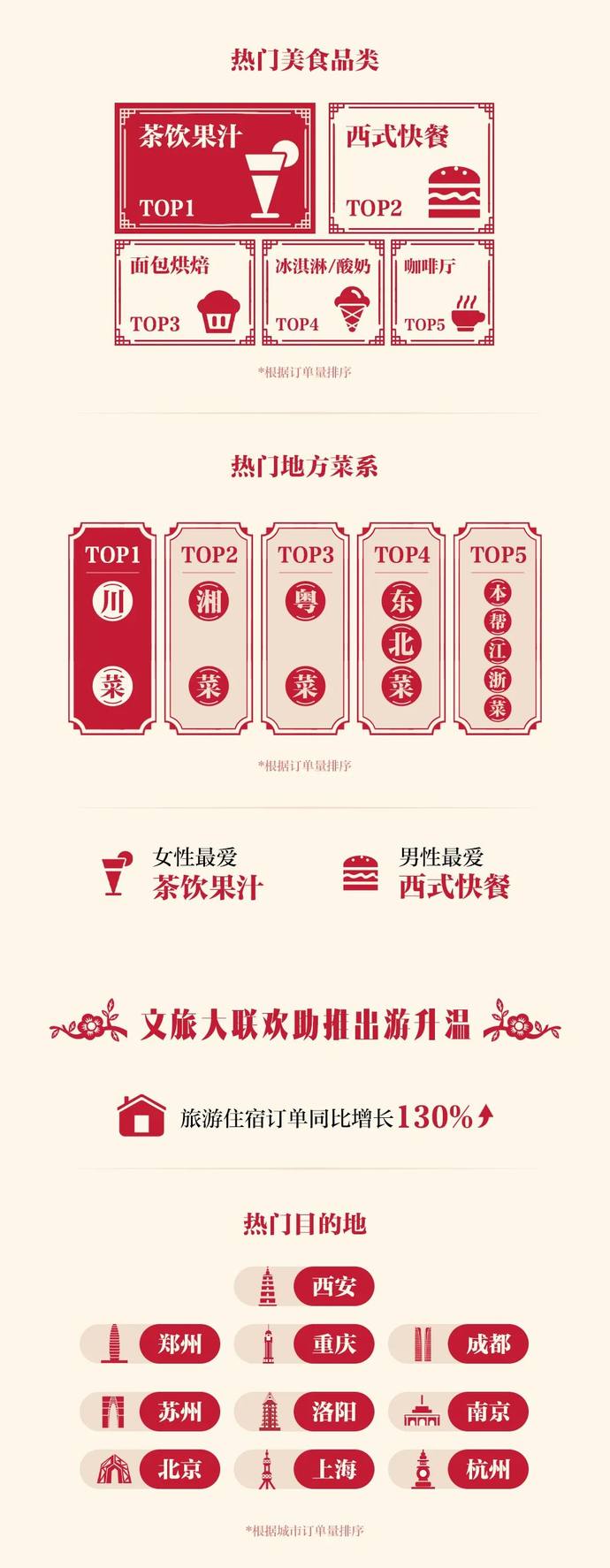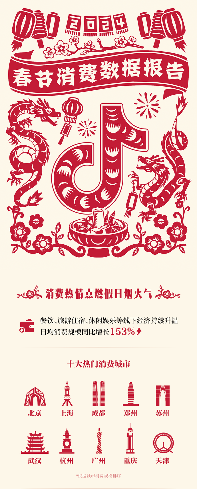 吃喝玩樂全線升溫,迎來龍年消費市場“開門紅”。春節假期,抖音上美食訂單同比增長99%,旅游住宿和休閑娛樂相關訂單同比增長130%和119%。