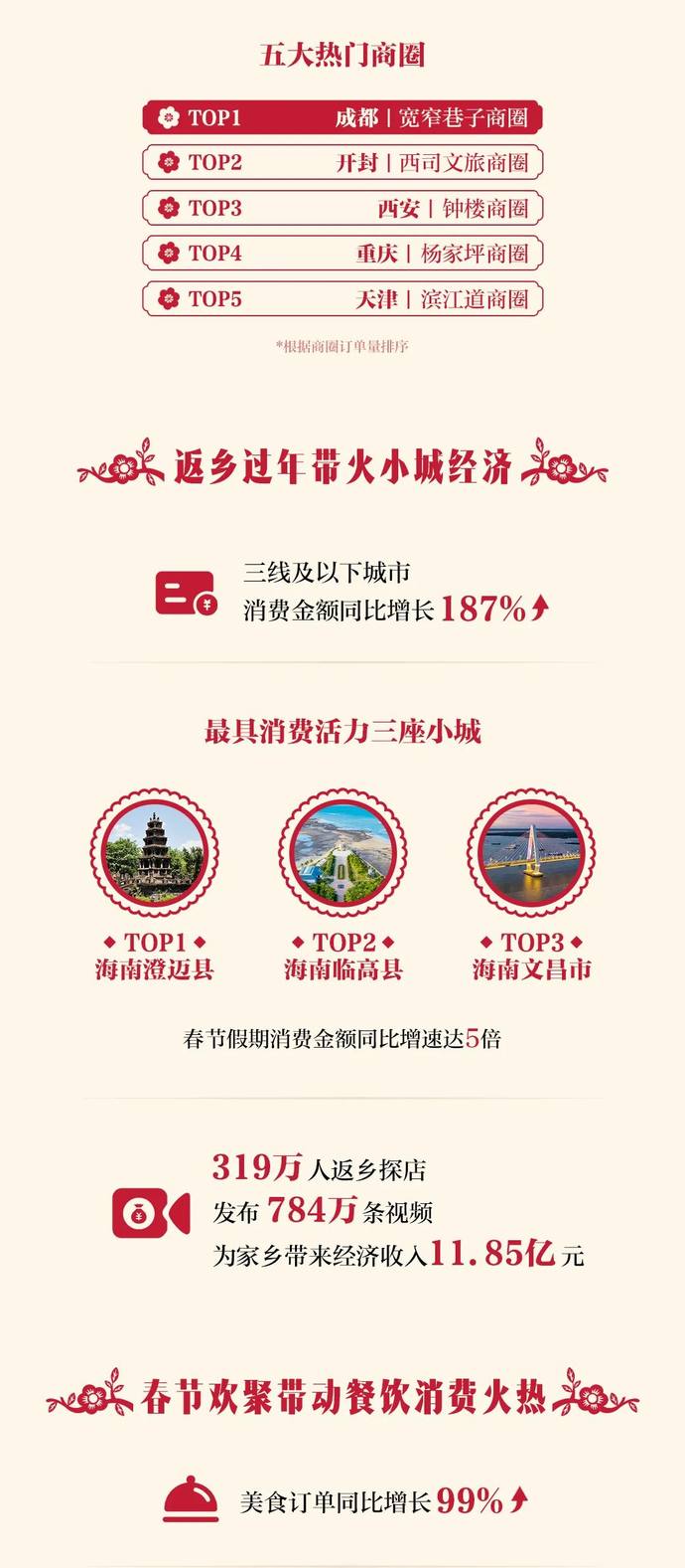 這個假期,線上線下消費活力持續釋放。吃喝玩樂等生活服務業日均消費規模同比增長153%。返鄉過年帶火小城經濟,319萬人返鄉探店,發布的探店視頻為家鄉帶來經濟收入11.85億元。