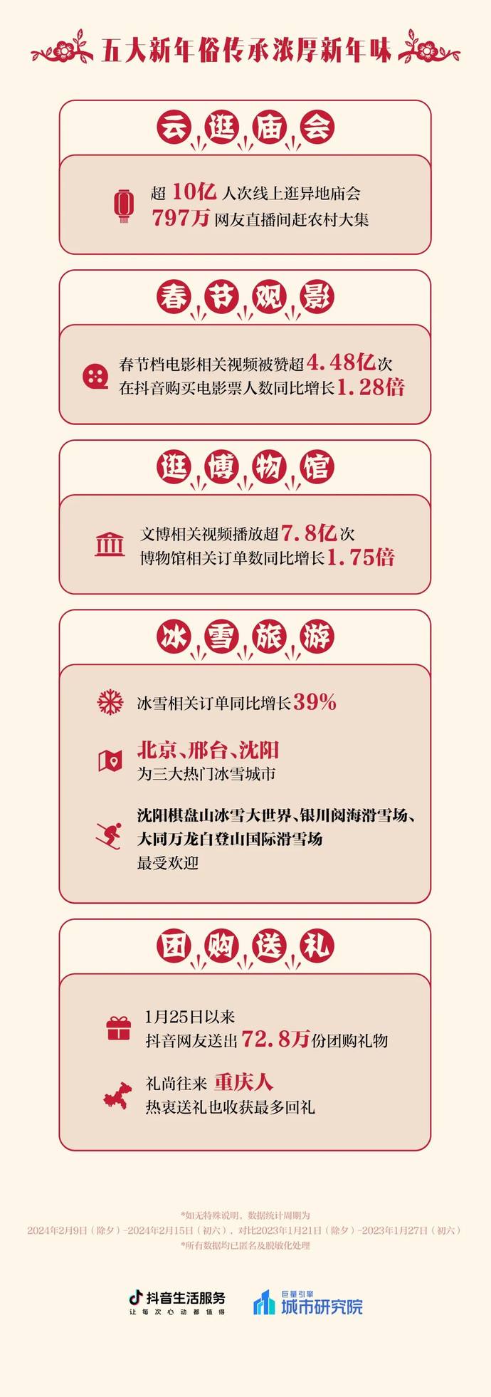 超10億人次線上逛異地廟會,在抖音購買電影票人數同比增長1.28倍,博物館相關訂單數同比增長1.75倍……云逛廟會、春節觀影、逛博物館、冰雪旅游、團購送禮成人們過年新習俗。