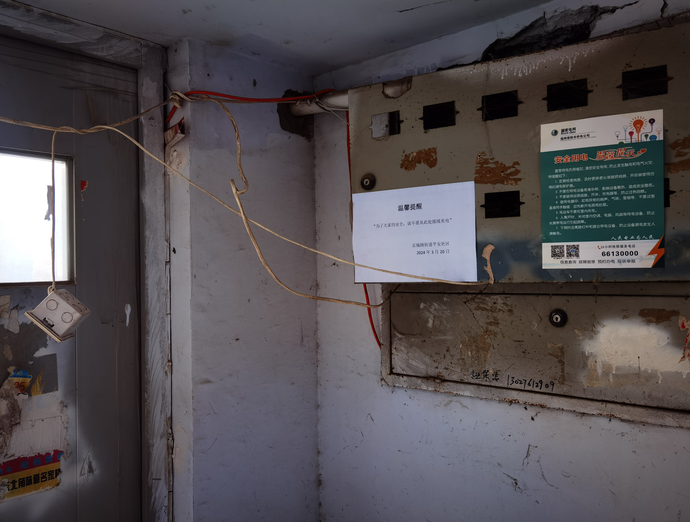 在1號樓3單元東側的通道邊,由6樓垂下的電線被放在了一樓的窗口,3單元樓洞內的墻壁上則固定著一個插線板,地上也有充電線沒有被清理。