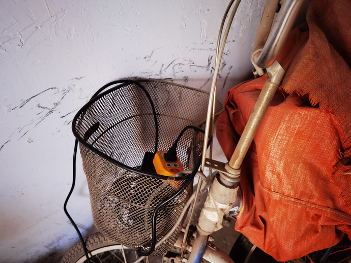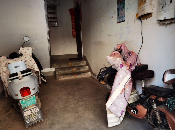 在15號樓2單元樓洞之中,一輛電動車正使用樓上接下的電線進行充電,插線板則放在旁邊自行車的車簍之中。隨后,在14號樓1單元、8號樓2單元、7號樓2單元等多棟居民樓,記者都看到了停放在樓棟口的電動車和從不同樓層垂下的飛線,部分插線板裸露在一層窗下或直接置于地面,僅靠外邊套著的塑料袋隔絕雨水。
