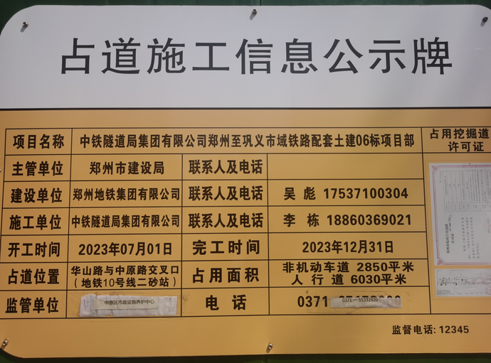 據公示牌顯示:該處項目為“鄭州至鞏義市域鐵路土建工程”,占道位置為地鐵10號線二砂站的華山路與中原路交叉口東北角出口,占用人行道6030平方米,占用非機動車道2850平方米。項目開工日期為2023年7月1日;竣工日期為2023年12月31日。建設單位是鄭州地鐵集團有限公司;施工單位是中鐵隧道局集團有限公司。