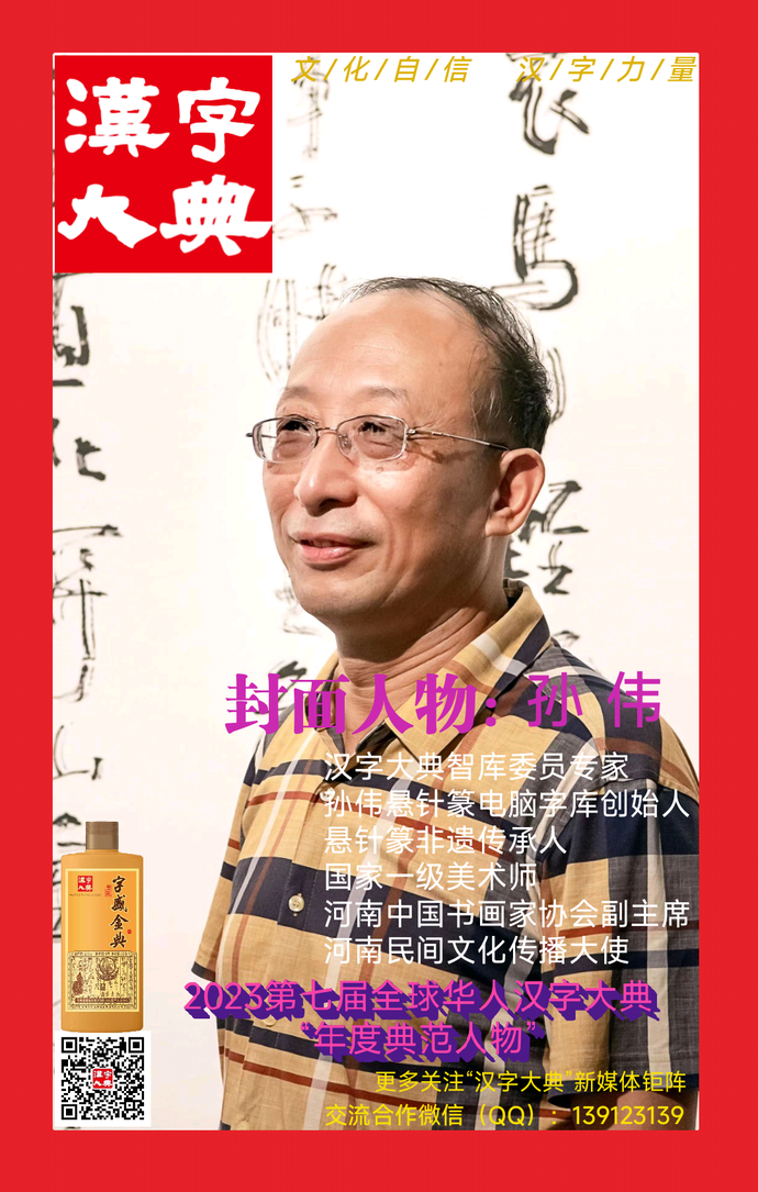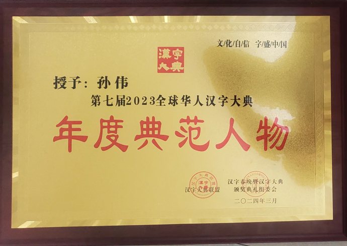 國家一級美術師、懸針篆非遺傳承人、電腦字庫創始人孫偉等人喜獲“第七屆2023全球華人漢字大典年度典范人物”。孫偉多次為國內重大活動,如拜祖大典和洛陽牡丹花會等題字,曾在上海、鄭汴洛等多次舉辦個展。孫偉多年來一直致力于弘揚優秀非遺和傳統文化,被評為“河南民間文化藝術傳播大使”“河南省省直機關先進藝術工作者”。