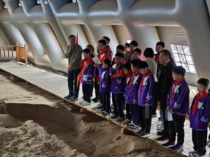 孩子們在工作人員的帶領下,認真參觀一處處考古遺址,學習了先民如何構筑地基、建造房屋,見識了精美的出土文物。今年在讀小學六年級的劉亦辰同學說:“自己在這里仿佛陷入了‘歷史的海洋’,感到古人非常有智慧,砌墻、夯土的技術到現在還在使用,真的太厲害了。”此外,劉亦辰還深有感觸地表示,此前在課堂上學習的知識,都只能聽老師講,或是從圖片獲取感受,親身來到考古發掘的遺址中,是一種十分不同的學習體驗。