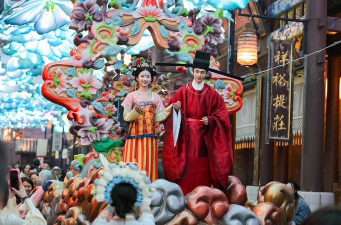 節假日期間,建業電影小鎮推出的“國風霓裳四月天”活動受到追捧,從早到晚,遍布全園的國風NPC市集與上百場節目讓游客們驚喜不斷。白天,畫彩扇、眉間點朱砂、合照互動……與高顏值達人的近距離接觸讓現場游客歡呼不已;傍晚時分,花燈璀璨,達人們化身花神,在古街長巷巡游,向游客行禮致意;夜幕降臨,太極湖畔,打鐵花如流星散落。在流光溢彩的映襯下,達人們起舞翩躚,為游客獻上一場如夢似幻的視覺盛宴。