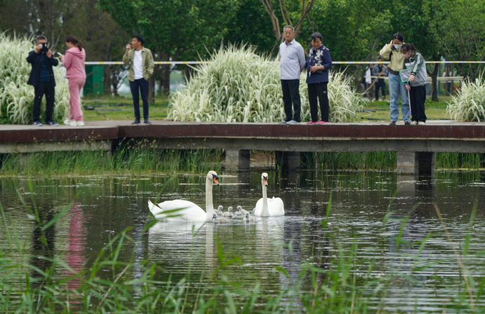 自4月16日出殼以來,五只小天鵝一天天長大,如今體型已經比剛出殼時大了一倍。白天,它們或在水上嬉游,或在水草間覓食,或在草地上曬太陽,憨態可掬的模樣萌化了一眾游客。