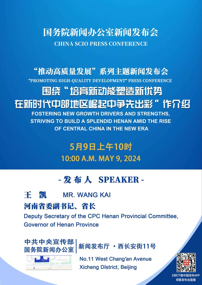 5月9日上午10時,國務院新聞辦公室“推動高質量發展”系列主題新聞發布會河南專場將在北京舉行。省委副書記、省長王凱將圍繞“培育新動能塑造新優勢,在新時代中部地區崛起中爭先出彩”主題介紹河南推動高質量發展有關情況,并與省委常委、常務副省長孫守剛,副省長張敏,省發展改革委主任馬健回答媒體記者提問。