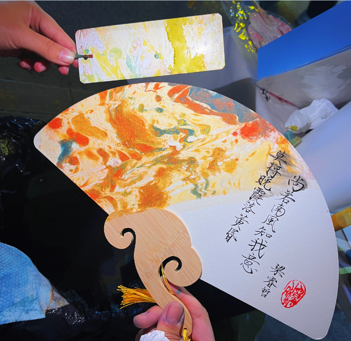 市民還可現場挑選配色,將漆液滴入水中、勾畫改變大漆的紋路,漆液在水流和外力的作用下,隨意其形,或有大面積明艷的撞色搭配,或高山流水留白古樸。再持一扇輕緩入水,沉入提轉之間,扇面便浮現出斑斕抽象的圖案,似河流、星云、田野、天空、森林……(如圖)DIY出一把獨屬于自己的漆扇,體驗古人清風徐來的愜意,這份“開盲盒”的快樂,你想和哪個“搭子”共享?