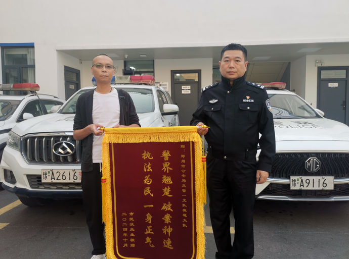 10月14日下午,在鄭州交警一支隊,一名群眾滿含感激之情,將一面精心準備的錦旗鄭重遞交給夜巡大隊副大隊長鄔豫龍的手中,錦旗上“警界翹楚 破案神速 執法為民 一身正氣”的金色大字熠熠生輝,以此表達對執勤交警公正執法、心系民眾的深深敬意和感激之情。