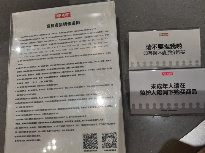 據泡泡瑪特的店員介紹,盲盒系列商品通常由常規款、隱藏款組成。同一系列產品,常規款抽取概率相同,概率為1/每套系列常規款總個數。盲盒系列商品隱藏款出現的概率,是基于每一特定盲盒系列全部生產數量設定的,因此即使整箱購買也無法保證一定含有隱藏款,例如12款常規款+1款隱藏款生產配比為1:144,即每生產144個產品中有1個是隱藏款;9款常規款+1款隱藏款生產配比為1:108,即每生產108個產品中有1個是隱藏款。設置隱藏款的目的是增加盲盒的趣味性,商家不鼓勵任何投機行為,提醒廣大消費者理性消費,也會協同家長助力未成年人形成安全、理性、健康消費的消費觀念。