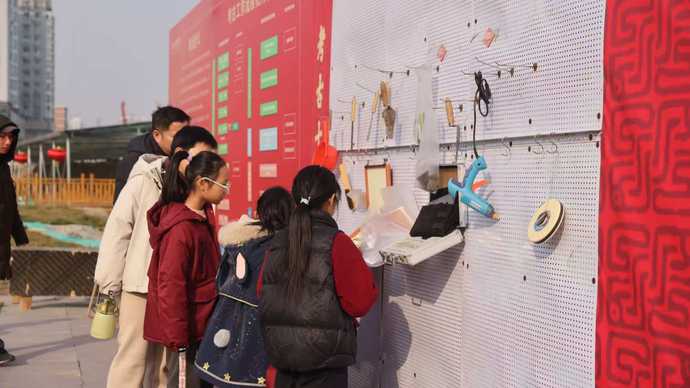 在“書院街的答案”現場,不少市民查看著可正反轉動的小展板,“這一面寫的是‘爵’字,背面就是對‘爵’的釋義,真是新穎有趣!”市民黃女士一邊翻看,一邊為這樣新穎的設計點贊;接瑞納福·新春露營活動現場,紅色的露營帳篷、喜慶的醒獅、紅彤彤的龍鼓,更是吸引市民或坐在露營帳篷邊享受冬日暖陽,或戴上醒獅獅頭歡欣舞動,更有市民邊擂響龍鼓,邊拍照打卡,大家一邊游戲互動,一邊參觀體驗,新春版城市考古體驗課堂既有滿滿的求知欲,也有濃濃的新年味。“我家就在附近,今天專程再來看看。”