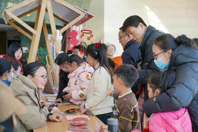“您好,這里是新春集集樂打卡處,歡迎參加集章打卡活動!”在“新春集集樂”打卡點,工作人員熱情地向前來參加活動的觀眾詳細介紹參與方式與規則。另一邊,一位觀眾正在活動提供的專屬空白座簽上加蓋印章,只見他蓋下、再抬起印章,一枚枚清新靈動的紫色、青色、綠色小蛇紋就出現了,栩栩如生又活潑可愛的造型,不一會兒便吸引了幾位家長帶領小朋友們前來蓋章留念。來到“新春大禮包”領取處,一張張精美的蛇年日歷吸引了游客的眼球。“這上面印制的是非遺年畫《蛇舞花間送福來》,寓意著福到吉祥,貼在家中很實用、也很好看。”在博物館工作人員介紹下,一位市民便拿起手機,開始了他的“活動記錄”,并成功領取到新春年畫日歷。乙巳蛇年主題水杯包、靈蛇小玩偶、蛇年主題書簽、新春主題燈籠……在獎品最為豐富的“新春兌兌樂”兌獎處,路過的觀眾正在饒有興趣地詢問“拿下”這些獎品的方法。
