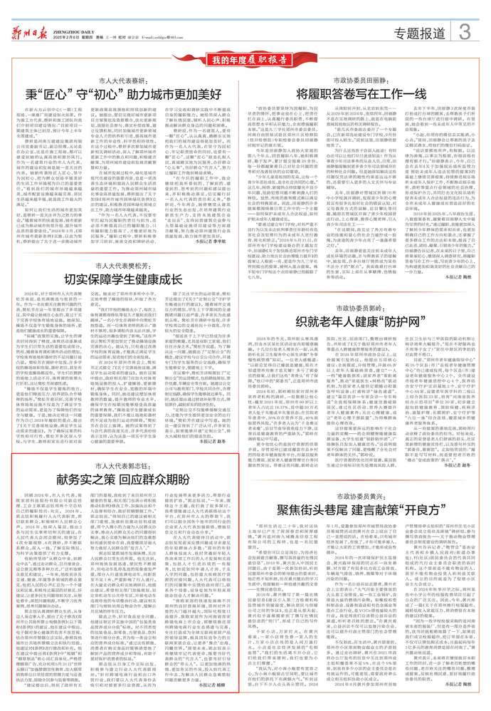 在2025年市兩會召開前夕,本報推出“我的年度履職報告”專欄,將鏡頭對準代表委員們,記錄他們履職盡責的生動實踐,展現他們心系群眾、為民代言的時代風采。讓我們共同聆聽他們的履職故事,感受為民情懷,汲取奮進力量,為鄭州更加美好的明天凝聚共識、匯聚力量。