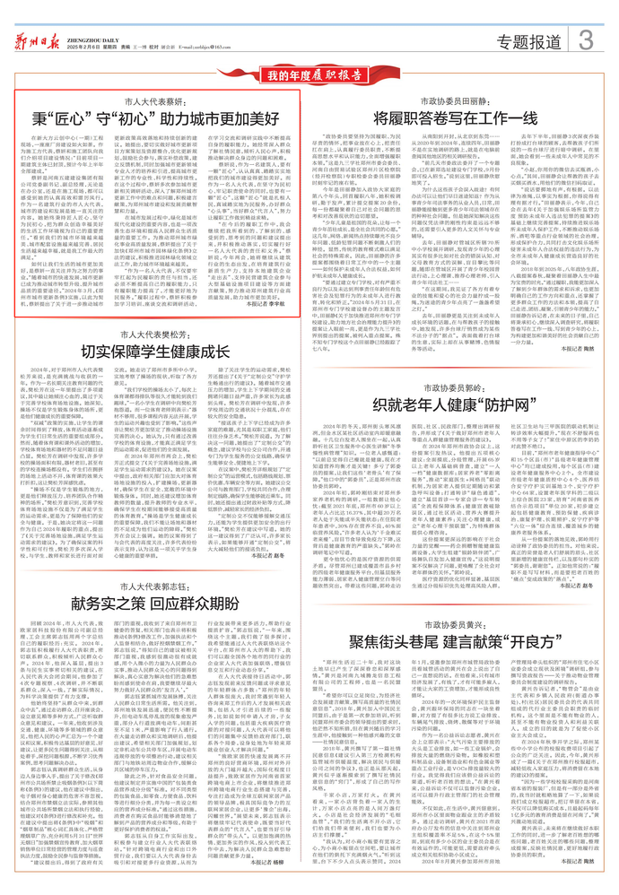 在2025年市兩會召開前夕,本報推出“我的年度履職報告”專欄,將鏡頭對準代表委員們,記錄他們履職盡責的生動實踐,展現他們心系群眾、為民代言的時代風采。讓我們共同聆聽他們的履職故事,感受為民情懷,汲取奮進力量,為鄭州更加美好的明天凝聚共識、匯聚力量。