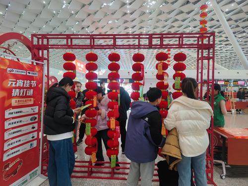 猜燈謎是元宵節的傳統民俗,T2航站樓出發大廳內一串串紅燈籠高高掛起,上面掛滿了精心準備的燈謎,將游戲規則制作成醒目的展板,放置在活動場地旁,鄭州機場工作人員還熱情又耐心地為每一位感興趣的旅客詳細講解。