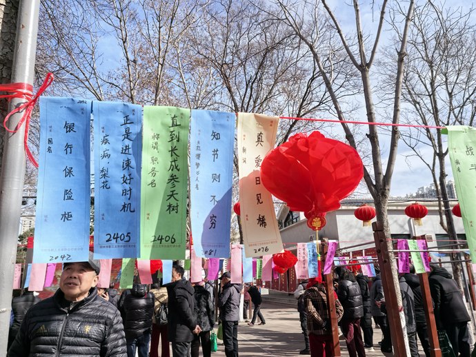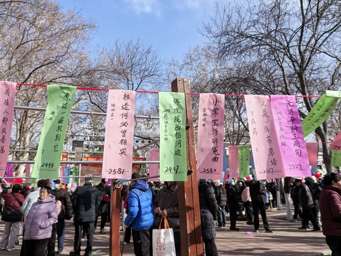 “精彩的啞劇。(打一句唐詩)”。“阿嬌暗泣有誰知?(打一句唐詩)”“這有點難了!真猜不出。”面對一些冷僻、難猜的燈謎,有人開動腦筋與朋友探討,有人拿出手機上網搜,猜中者喜笑顏開,猜不中者也不氣餒,繼續從別的謎語中尋找樂趣。