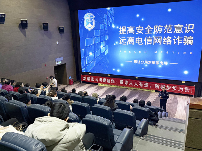 看電影學防范,電影院里的反詐宣傳深受群眾喜歡。2月14日,為提升轄區居民的反詐意識,增強群眾對電信網絡詐騙的防范能力,鄭州市公安局惠濟分局劉寨派出所創新形式,寓教于樂,將反詐課堂搬進電影院,在觀看電影的過程中開展反詐宣傳教育,保護群眾的“錢袋子”。
