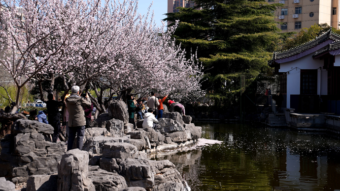紅杏鬧春,生機勃勃。金水河畔的杏花吸引不少市民游客打卡留念。