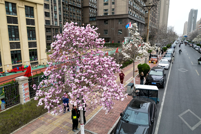 綠城玉蘭添春色,紅白相間俏枝頭。玉蘭街上的紅白玉蘭次第綻放,讓人感受到濃濃的春天氣息。