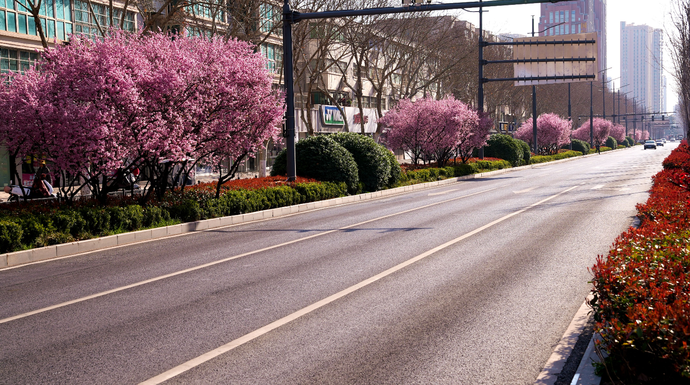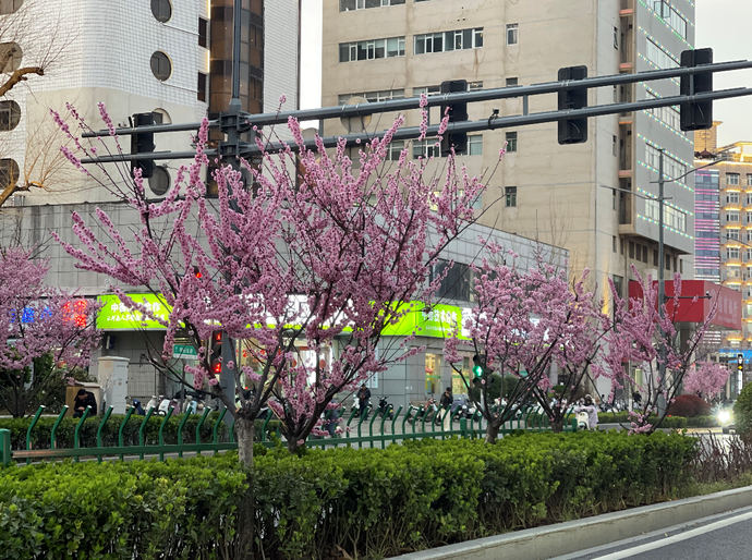 建設路上粉紅的美人梅競相綻放,形成了一條浪漫的粉色大道。