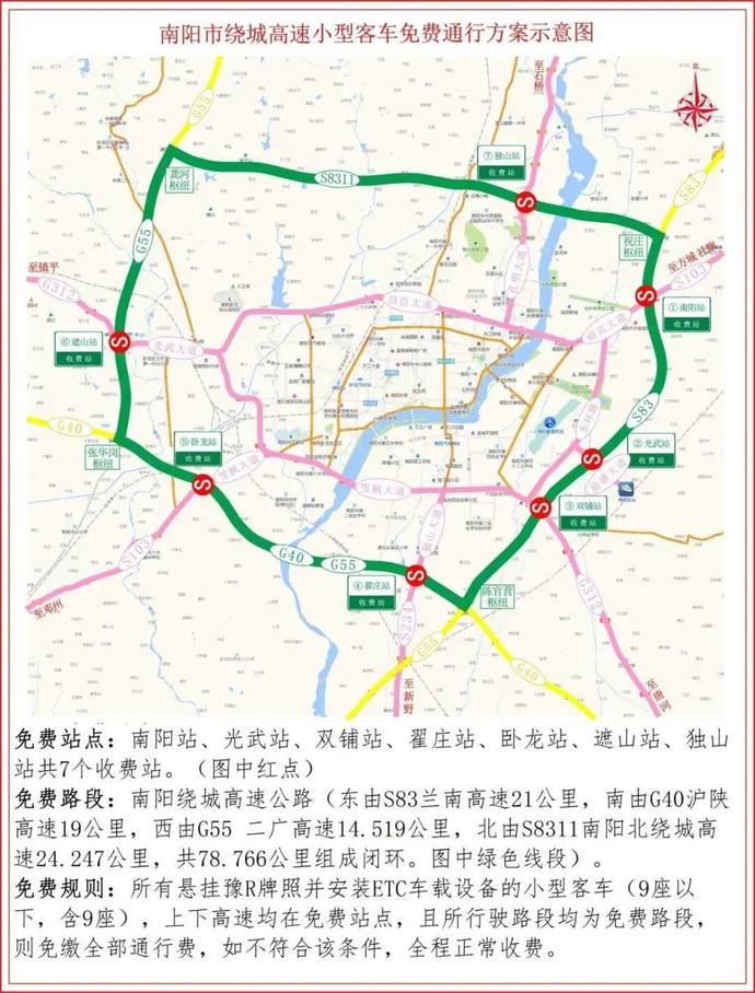 免費站點:南陽站、光武站、雙鋪站、翟莊站、臥龍站、遮山站、獨山站共7個收費站。