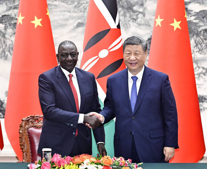 4月24日上午,國家主席習近平在北京人民大會堂同來華進行國事訪問的肯尼亞總統魯托舉行會談。兩國元首一致同意將雙邊關系定位提升至新時代中肯命運共同體。