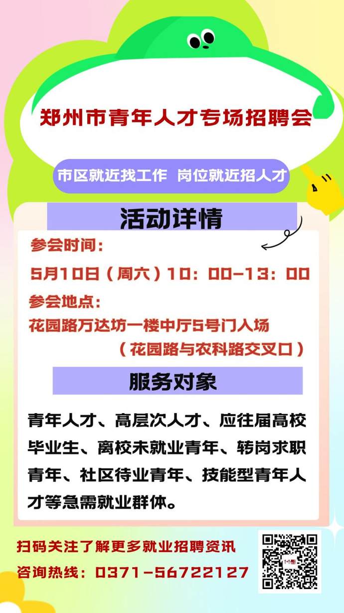 5月7日,記者從鄭州市金水區人力資源和社會保障局獲悉,5月10日(周六)上午,由鄭州市金水區人力資源和社會保障局、金水區文化路街道辦事處聯合河南123人才網,將在花園路萬達坊一樓中廳(5號門入場)舉辦鄭州市青年人才專場招聘會活動。