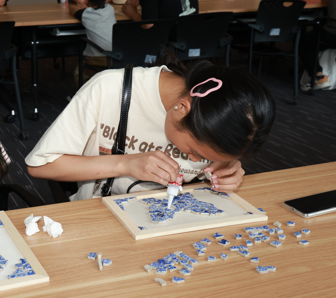 活動現場,前來體驗的市民游客在領取免費瓷畫材料后,便坐在桌前開始了自己的“創作之旅”。有的游客在青花碎片的圖案紋路中尋找合適的色彩銜接點,有的人則找尋碎片邊緣的貼合處,盡量讓瓷器圖案拼接地嚴絲合縫。“我正在嘗試讓所有的空隙都能拼上,把這個木質相框給鋪滿”專程來博物館參觀的大三學生張義昊說到。