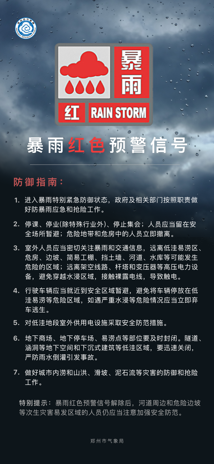 鄭州市氣象臺2025年6月19日13時43分發布暴雨紅色預警信號:目前航空港區已出現100毫米以上降水,最大降水量130.5毫米。預計未來3小時航空港區所轄鄉鎮及街道降水持續,還將出現30到40毫米的降水。請注意防范強降水可能引發的中小河流洪水、城鄉積澇等次生災害,相關部門需加強防洪防汛和交通安全管理;公眾出行注意避開低洼易澇等危險區域,行駛車輛應當就近到安全區域暫避。
