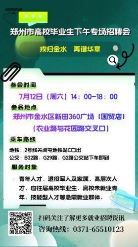 本周六,如果您有找工作的需要,不妨來這里看看吧——7月9日,記者從鄭州市金水區人力資源和社會保障局獲悉,7月12日(周六)下午,該局和金水區文化路街道辦事處聯合河南123人才網,將在鄭州新田360廣場(國貿店)舉辦鄭州市高校畢業生下午專場招聘會活動。
