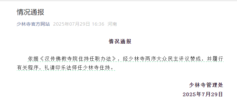 7月29日,據少林寺官方網站:依據《漢傳佛教寺院住持任職辦法》,經少林寺兩序大眾民主評議贊成,并履行有關程序,禮請印樂法師任少林寺住持。