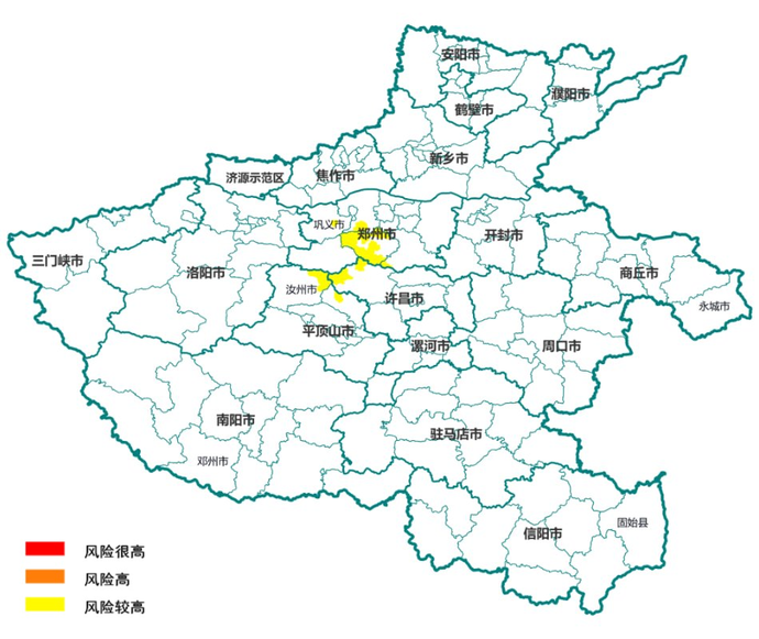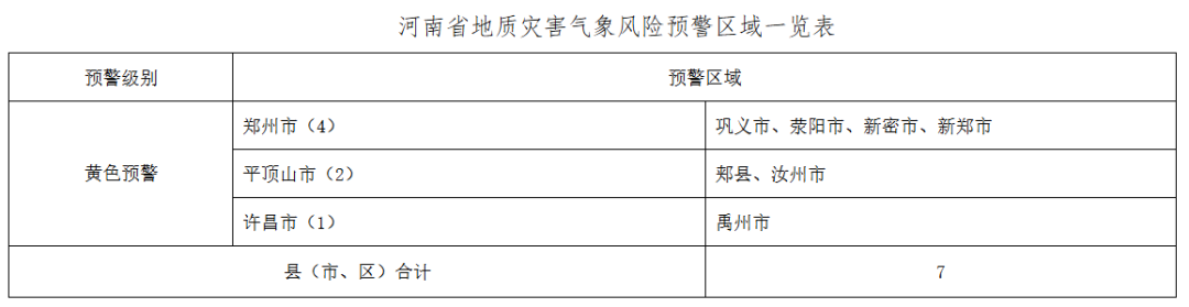 2025年8月6日8時至6日20時,河南省地質災害氣象風險預警達到黃色預警的區域為:鄭州市、平頂山市、許昌市3個省轄市,7個縣(市)。