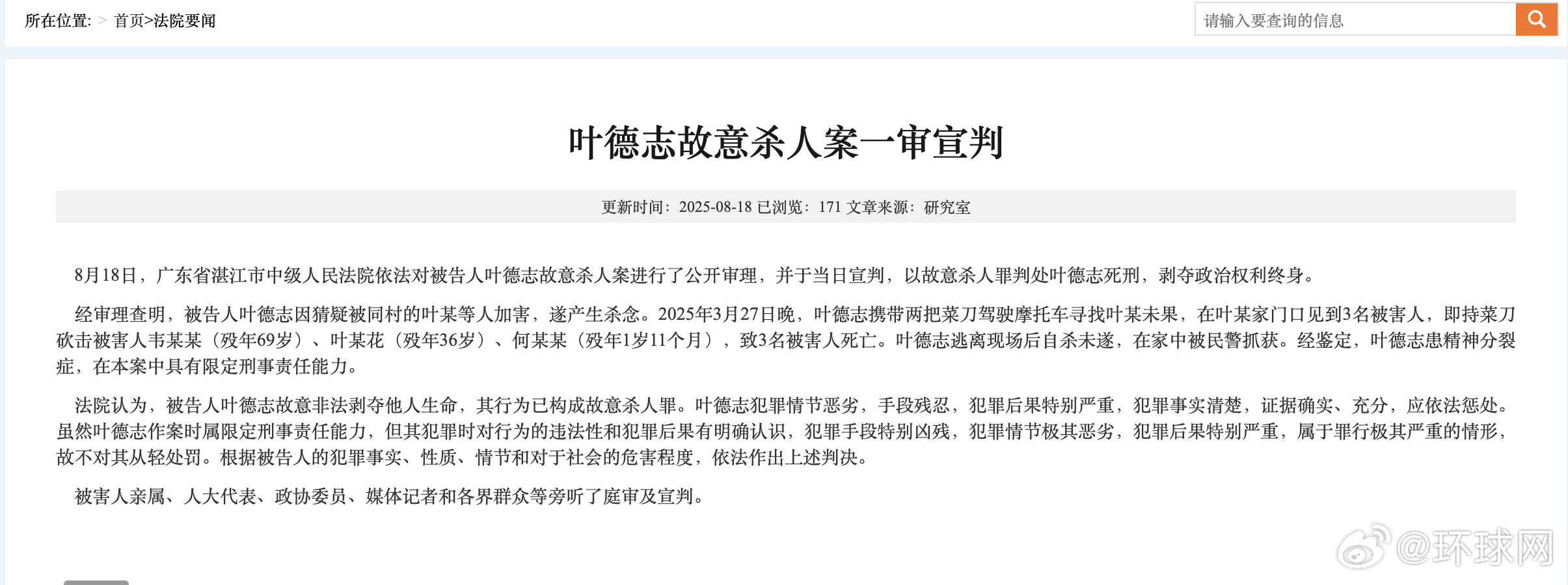 8月18日,廣東省湛江市中級人民法院依法對被告人葉德志故意殺人案進行了公開審理,并于當日宣判,以故意殺人罪判處葉德志死刑,剝奪政治權利終身。