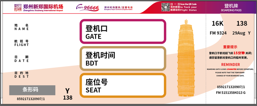 目前的登機牌已經使用了多年,自今年9月10日起,鄭州機場開始陸續使用新版登機牌,新版登機牌在設計上把原有3聯版面簡化為2聯,為方便旅客閱讀識別,專門放大登機口、座位號等核心信息,解決老年及首乘旅客找信息難的問題;同時融入“老家河南”地域元素與黃河印記,中國紅搭配黃河金的配色,讓出行承載家鄉溫情。