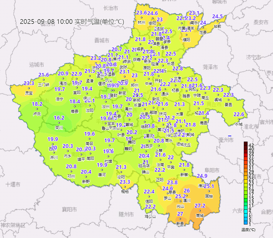 新的一周,河南依然在陰雨天氣中開啟。今天上午,天空云層較厚,大部分地區有降雨云系發展,黃淮之間多地出現小到中雨,其中東部和南部部分地區雨勢較為明顯。上午10時,除東南部地區氣溫25-27℃以外,其他地區氣溫普遍在20℃左右,涼意逐漸加重,體感舒適。