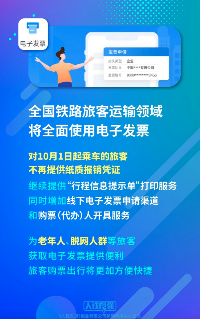 全國鐵路旅客運輸領域將全面使用電子發票,對10月1日起乘車的旅客,不再提供紙質報銷憑證,繼續提供“行程信息提示單”打印服務,同時增加線下電子發票申請渠道和購票(代辦)人開具服務,為老年人、脫網人群等旅客獲取電子發票提供便利,旅客購票出行將更加方便快捷。