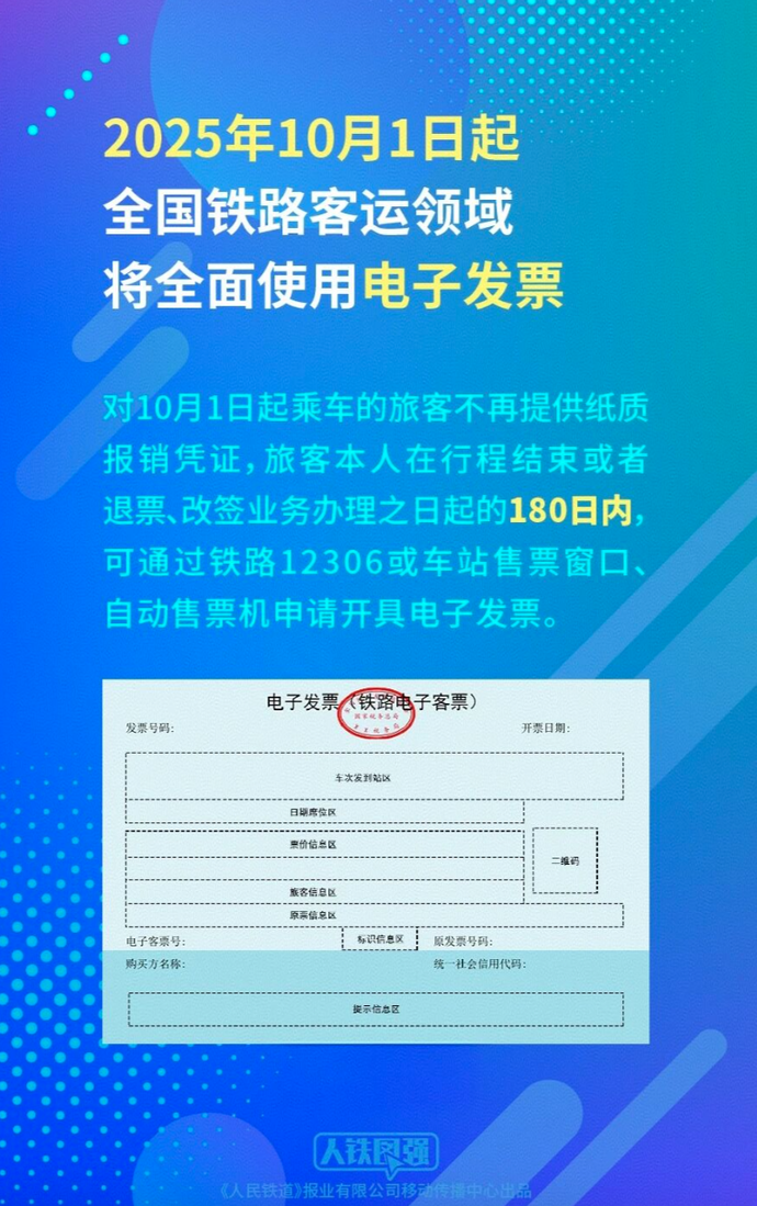 按照國家稅務總局、財政部、國鐵集團聯合發布的2024年第8號公告,2025年10月1日起全國鐵路客運領域將全面使用電子發票,對10月1日起乘車的旅客不再提供紙質報銷憑證,旅客本人在行程結束或者退票、改簽業務辦理之日起的180日內,可通過鐵路12306或車站售票窗口、自動售票機申請開具電子發票。